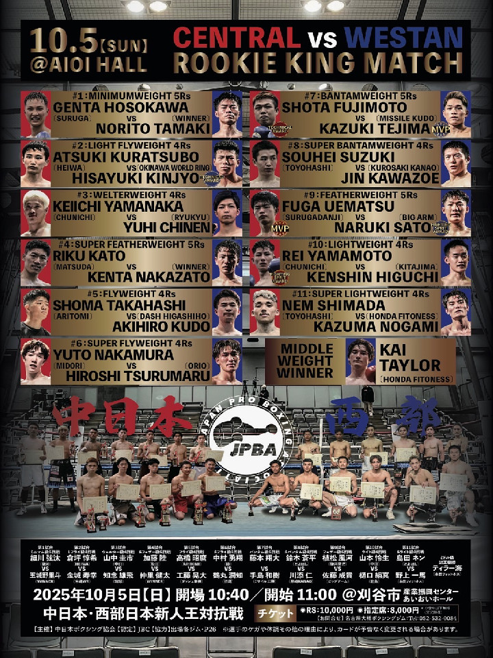 中日本VS西部日本新人王対抗戦は10月5日(日)に開催。