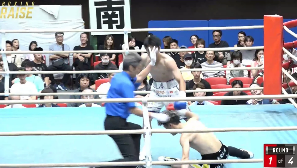 守屋龍之介選手は初回にダウンを奪われる劣勢から猛攻撃を続け4Rに勝輝ジムの曽田翔貴選手からダウンを奪い返して逆転TKO勝利。