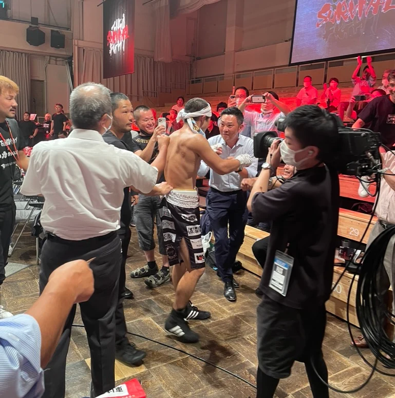 クマール選手が右肩の脱臼をアピールして1R途中で花田選手のTKO勝利。