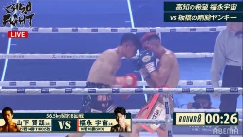 おとなし目なキャラの福永選手を試合前の煽り動画から挑発し、試合では激しいどつき合いに巻き込んで会場を沸かせ、福永選手の実力を証明し、注目選手に押し上げたのは山下賢哉選手の功績でしょう。