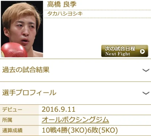 KWORLD3所属のマジスカ小坂選手と対戦する高橋良季選手は4勝3KOと高いKO率を誇っていますが、同時に6敗のうち5敗がKO負けというKO負け率の高さも目を引きます。