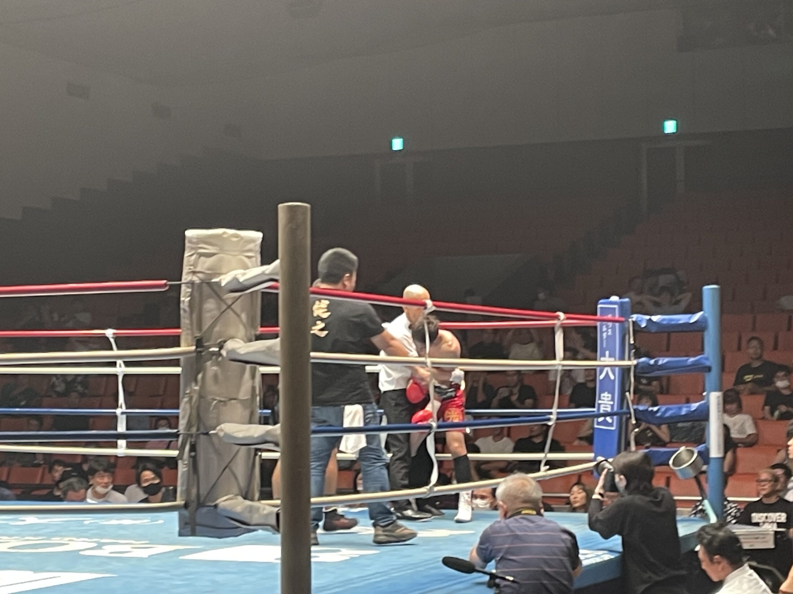 中国側の青コーナーはJBスポーツジムのゾンビボクサー田村亮一選手。
