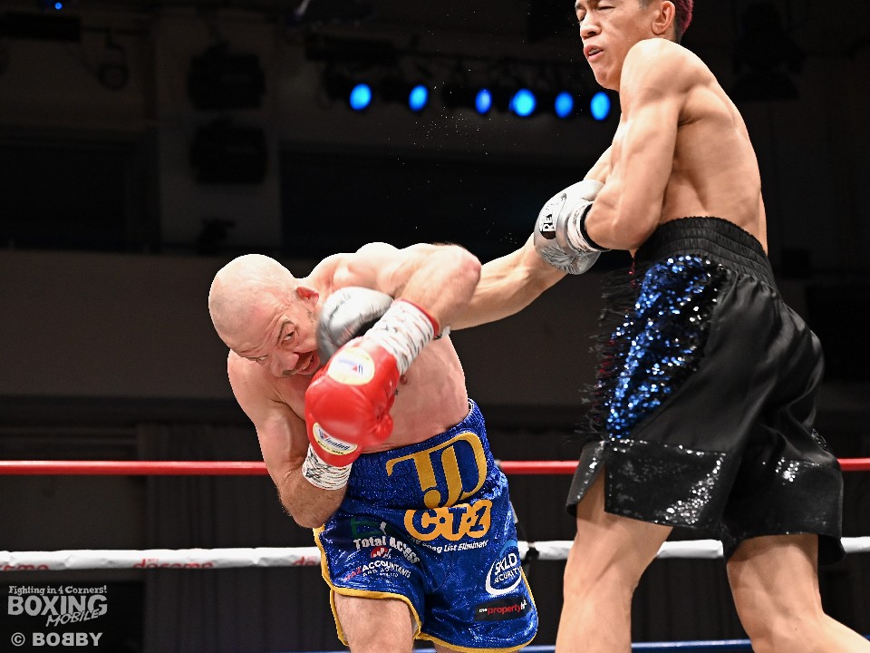 牧田選手がジャブ、ワンツーから放ったワンツーフック。