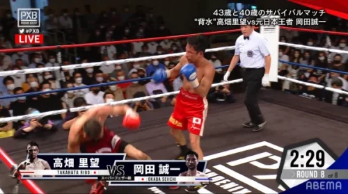 2R目、高畑選手は遠い距離からの飛び込むパンチ。岡田選手は中に入って接近戦。お互いの持ち味を発揮するが、高畑選手の左右アッパーの見栄えが良い。ラスト1分のところで高畑選手の右ストレートで岡田選手がゆっくりとダウン。ここで高畑選手もまとめるが岡田選手もボデイを返して反撃。