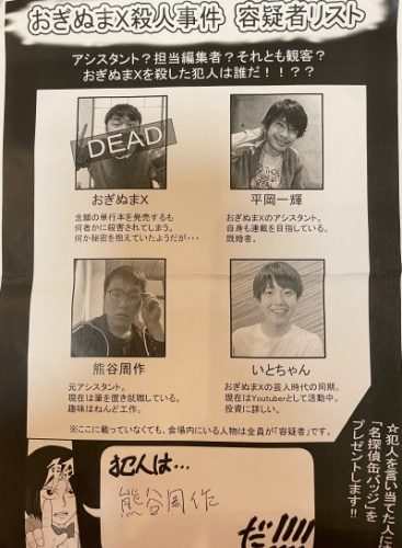 今回のサイン会は、サイン会の後でおぎぬまXさんが殺害されて犯人を探すというイベントがついた不思議なサイン会企画になっていました。