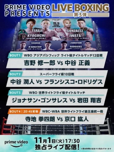 prime videoで村田諒太選手や井上尚弥選手の試合、拳四朗VS京口戦が配信された際は何時に配信が始まり、何時頃メインが始まるかの目処が事前に発表されていました。