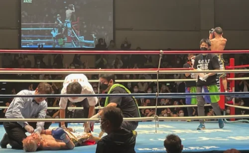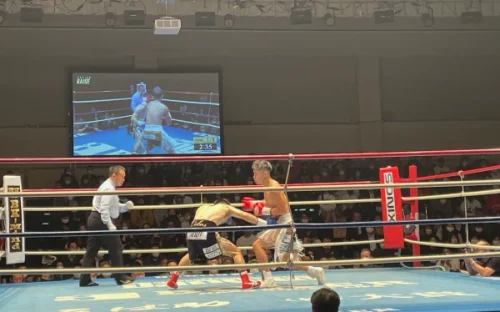 会場内がドミンゴ選手のパワーにざわつく中、2Rにドミンゴ選手の左からの右で飯村選手まさかのダウン。