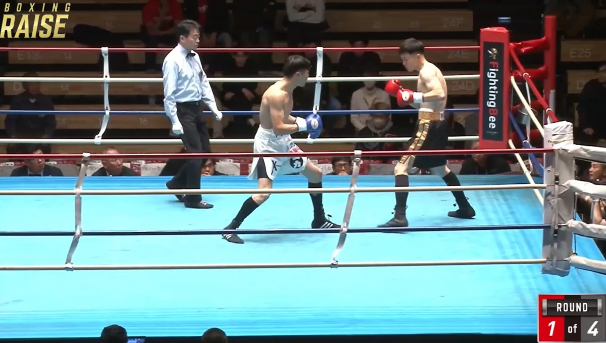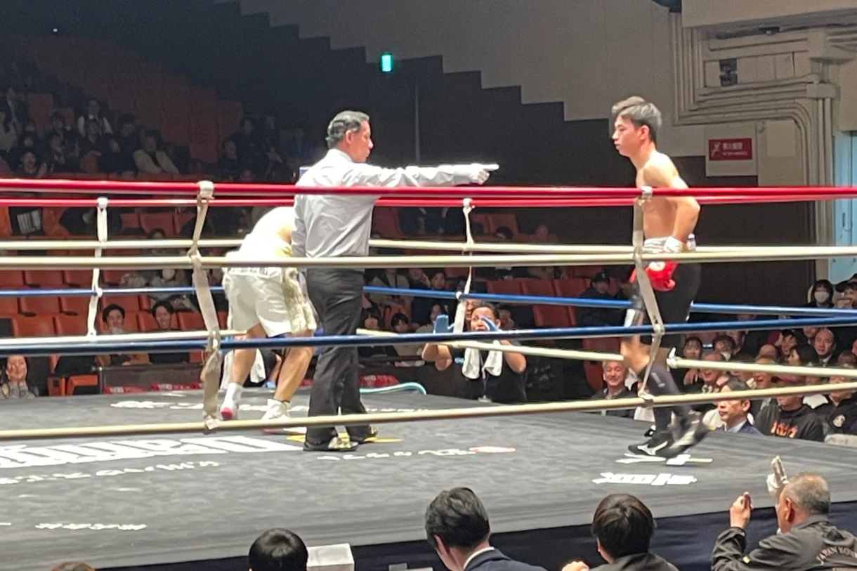 輪島功一氏の孫、磯谷広太選手はデビュー戦で消防士ボクサー藤原蓮選手と対戦。