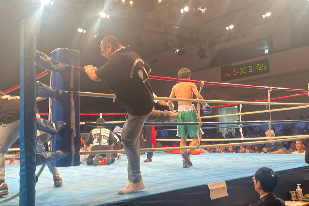 開始早々にダウンを奪われた大久保選手は慌てて立ちあがろうとするがセコンドからしっかり休むよう指示がありカウント8まで休む。