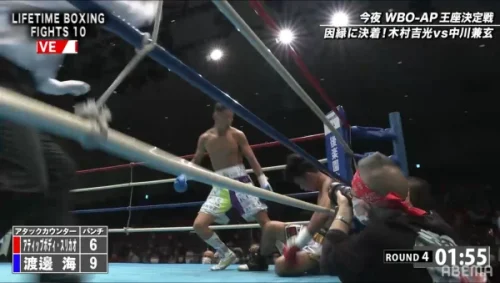 2R目、渡邊選手はスリカオ選手の左ストレートを外して右ストレートを好打。