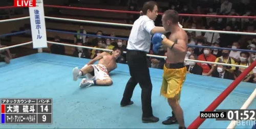 6R目、大湾選手攻勢に出てワンツーワンツーで下がらせるが、ヘラルド選手の頭が当たり、レフェリーが注意しようとしたところヘラルド選手が止まらずパンチを打ち込み大湾選手倒れる。ここはヘラルド選手に減点1。大湾選手ダメージがあるのか動きが落ちて右フックをもらう。