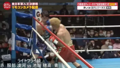 服部選手の逆サイドブロックで勝ち上がっているのが大橋ジムの長身ボクサー島田拓実選手。