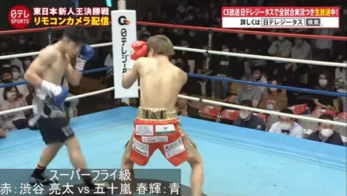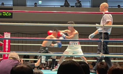 高橋選手はボディを軸に積極的に前に出ましたが、渋谷亮太選手のリラックスした状態からのパンチの方が的確性で若干勝りました。