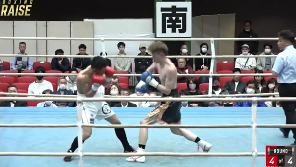 國川選手がガードの低い寺下選手に左を打ち下ろす場面もあったものの、基本的には寺下選手のスピードにややついていけていない國川選手がバランスを崩したところに寺下選手がパンチを打ち込みつつ、時折飛び込んでのワンツーもヒットさせてポイントを重ねていきました。